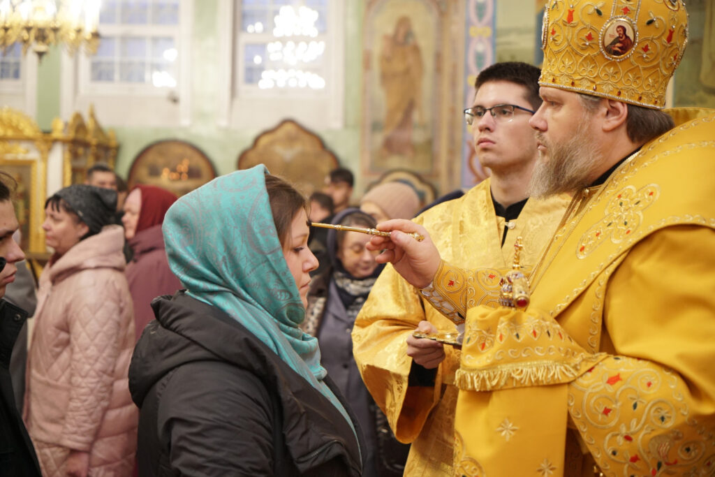Его Преосвященству сослужили: ключарь собора протоиерей Александр Петров, протоиерей Владимир Ащеулов, иерей Иоанн Шкуропацкий, диакон Вадим Шпак, диакон Никита Гологузов, диакон Артемий Волков.